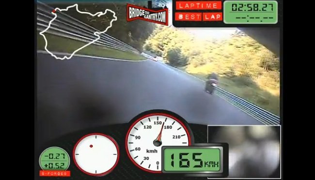 No es por comparar con malas intenciones, pero la vuelta que vamos a ver a continuación es sensiblemente más lenta que la de antes por varias cosas: el piloto es Tim Röthig, profesional, y pilota una Kawasaki ZX-10R que lleva montada una cámara giroscópica (impresiona todo y más) y además ha conseguido que le dejen el circuito vacío para dar un par de vueltas. Y hace un tiempo más lento que el misterioso piloto anónimo de antes. Ahora sí, para quitarse el sombrero o lo que queda de él.