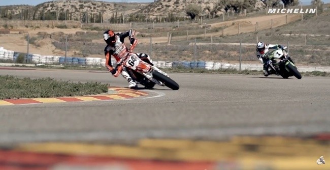 Qué puede haber más gratificante que enfrentar a una Superbike con una Supermotard en un circuito sólo por el mero hecho de pasarlo bien. Ni tiempos, ni intentar batirse el uno a otro. Únicamente diversión y unas buenas dosis de edición de vídeo y diferentes tomas para disfrutar durante algo más de dos minutos.
