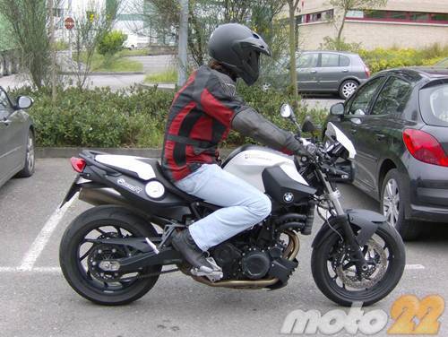La F800R se nota bastante larga entre ejes, lo que la penaliza un poco al intentar moverla en un palmo de terreno a base de golpes de cadera. Es bastante más larga que la Honda CB1000R y la Buell XB12STT, en ciudad se nota. En parado, se mueve sin problemas, aún con el amortiguador de dirección que monta de serie, pues sus 200kg en orden de marcha están muy centrados, y su asiento bajo permite llegar al suelo con facilidad. Como opción, existe uno más alto y otro más bajo.