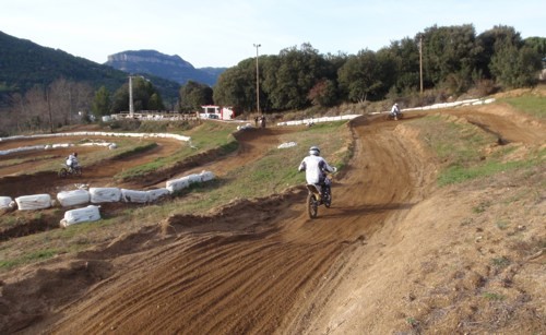 Lo más sorprendente al llegar al circuito es la ausencia de ruido. Estás viendo rodar las motos, pero no se oye nada. Nada. De entrada, es un contraste enorme con lo que estamos acostumbrados que pase al ver rodar las motos de enduro o de cross. Apenas se oye un pequeño zumbido del motor (vaya, como la lavadora de casa...) y las ruedas rodando sobre la tierra. Silencio. De hecho, en la siguiente fotografía podéis observar lo cerca que están las casas del pueblo del circuito, cosa imposible si se rodara con motos de gasolina. Esta será una de las claves para facilitar el desarrollo de este tipo de instalaciones, al poder estar muy cerca de los núcleos habitados. Y seguramente, de la propia evolución del enduro y el cross.