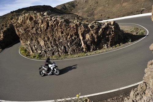 La moto es tan polivalente que acepta que la metas en carreteras de este tipo sin quejarse. Pero domar 150 CV y 220 kg en orden de marcha no es fácil. Gracias a la posición y al amplio manillar siempre tienes el control de la situación, y si a esto le unimos el embrague anti-rebote, el ABS y el control de tracción tienes en tus manos una moto que no te la va a jugar en ningún momento. Solo tienes que ponerte las pilas tu y buscar el ritmo.