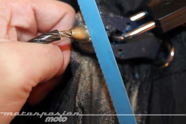 Ahora, si nuestro ladrón fuera ya un poco más sofisticado y espabilado se podría hacer con una sierra de pequeñas dimensiones para intentar cortar la perla de latón y así poder abrir la funda. Calculo por el esfuerzo y tiempo que nos ha costado hacer una simple muesca en ella, que en un par de horas de trabajo y con una precisión de relojero lograría cortar la perla de manera que pudiera liberar el cierre. Como veis algo inviable para cualquier ladrón que pretenda hacer un robo rápido del casco sin exponerse demasiado a que lo pillen en pleno proceso.