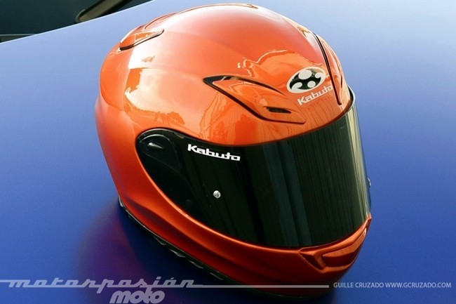 Empezando por lo primero que nos encontramos tenemos una calota externa fabricada en composite con dos tamaños a elegir en función de la talla interior. El diseño exterior recuerda mucho, especialmente en la parte trasera, a los Shoei de los últimos años. Las formas son fluidas y orgánicas con un aspecto muy aerodinámico en el que destacan especialmente con ésta decoración naranja cobrizo. Personalmente me parece la más bonita de las seis que hay disponibles (creadas por Bargy Desing) y la que más realza las formas exteriores de los estabilizadores laterales y trasero que en Kabuto llaman "wake stabilizer".