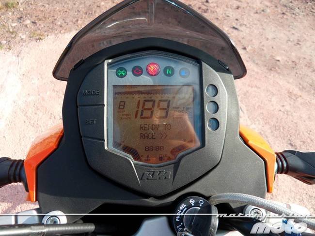 Como no todo es diversión y a veces no tenemos mas remedio que circular por tramos aburridos de autopista, esto es lo que vamos a hacer a continuación. Pero antes y mientras estamos parados en el semáforo, podemos juguetear un poco con el panel de mandos digital de la KTM 125 Duke, que tal y como os decía, es muy completo pero a la vez un poco particular. Los datos principales para circular están en la parte superior (revoluciones, marcha engranada, velocidad y kilómetros totales que puede ser cambiado por dos parciales).