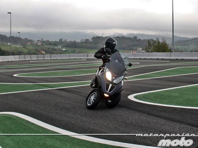 En sus pistas y vías de interconexión pudimos exprimir las prestaciones de la Piaggio MP3 400 LT, buscando las cosquillas al tren delantero. Bueno, siempre dentro de un margen de seguridad para no plegar la moto, uno de los mayores miedos de los probadores. Con ello pudimos sacar alguna conclusión que tardaríamos en observar en carretera, aunque también, la hemos llevado al límite, revelándonos información que quizás la mayoría de los usuarios no lleguen a percibir durante su utilización.