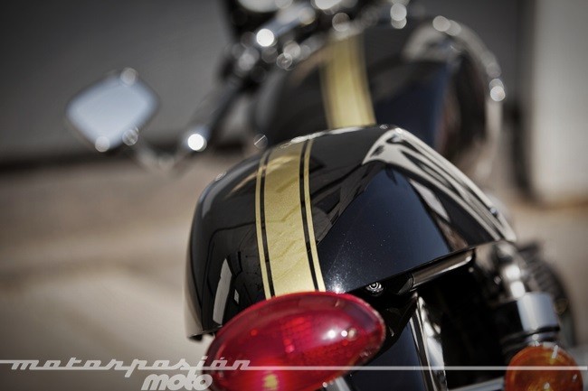 Por último y en cuando a la decoración, tanto el cupolino como la tapa del colín cuentan con una franja dorada pintada de serie. La Triumph Thruxton la podremos encontrar en dos colores a cual más precioso: el Negro Phantom de malomalote o el muy británico Verde Brooklands; ambos con la franja dorada.