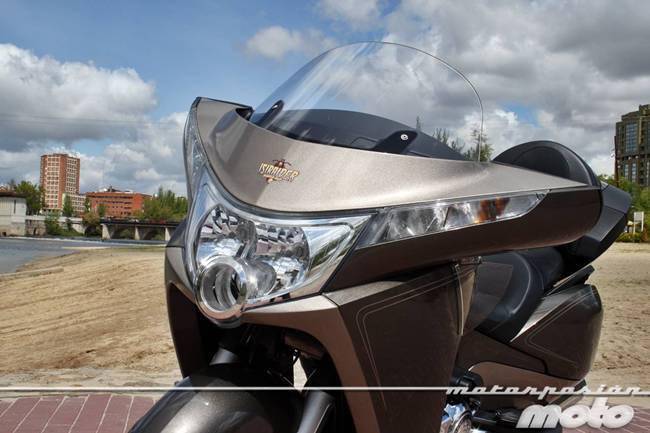 Lo primero que siento a sus mandos es la más absoluta comodidad. La protección es máxima y la postura casi perfecta. Los pies van cómodamente situados en las plataformas, unas plataformas muy largas que te permiten ir con los pies completamente estirados si quieres o más encogidos, en una posición más común. Los brazos descansan cómodamente en el manillar y las manos, perfectamente protegidas tras el frontal.