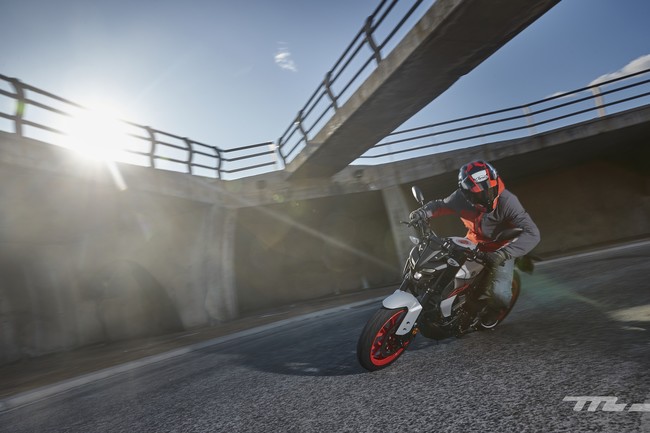 En ciudad la menor de las MT se siente como pez en el agua. Los desplazamientos con ella entre el tráfico urbano son pan comido gracias a un conjunto realmente estrecho, un radio de giro cerrado que nos permite maniobrar en un palmo y un peso muy contenido de tan solo 140 kg en orden de marcha.